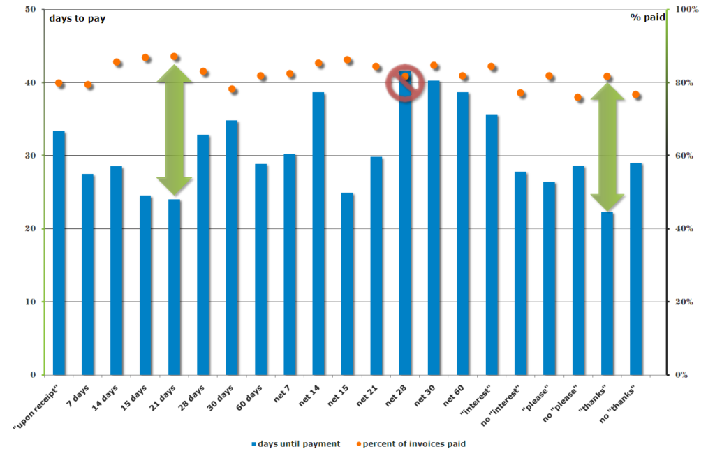 Great post from Fresh Books on the specific wording and language to include on your invoices. Depending on how you phrase it, you can increase the likelihood of getting paid on time, or at all, by upwards of 15%.