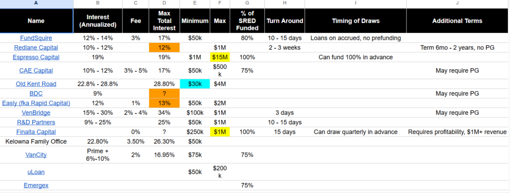 I’ve found that private lenders tend to be successful entrepreneurs who have used SR&ED themselves, or investors in debt funds like Espresso or OKR.